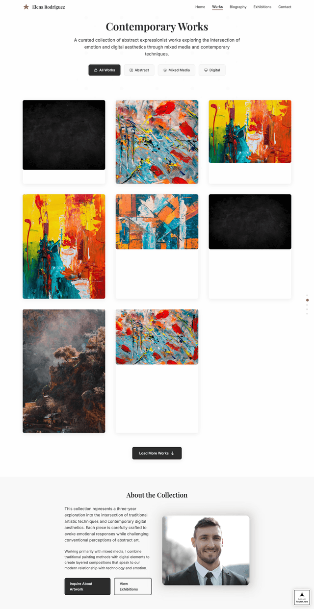 This artist portfolio template offers a clean and elegant way to showcase your creative work. It includes a dynamic gallery to display your art, a dedicated section for your professional bio, and easy-to-use contact forms. It’s perfect for designers, photographers, and artists looking to present their talent.