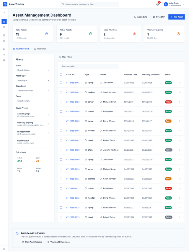 This FacilityPro template is a comprehensive solution for managing facility maintenance and operations. It features an interactive floor plan for equipment and space management, an intuitive technician assignment interface for optimizing workloads, and powerful reporting & analytics with predictive insights. The template also includes robust user management and system configuration settings to streamline facility management tasks.