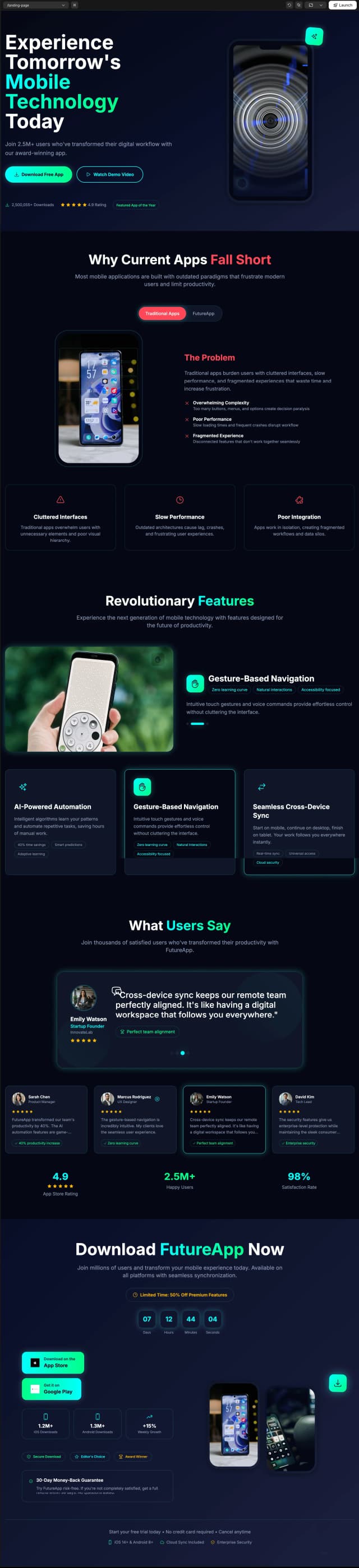 A sleek and futuristic mobile app showcase landing page that blends elegance with interactivity. It uses glowing edges, smooth transitions, and fluid layouts to create a visually immersive experience that highlights the app’s design and features. The interface feels dynamic yet minimal — built to engage users instantly while keeping navigation effortless and modern.