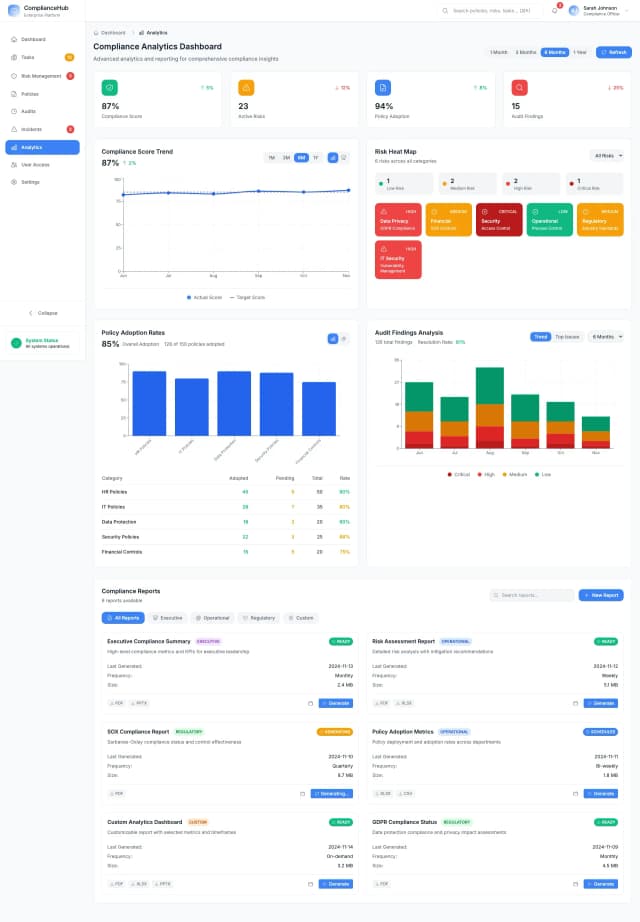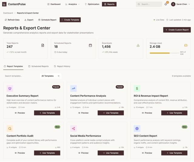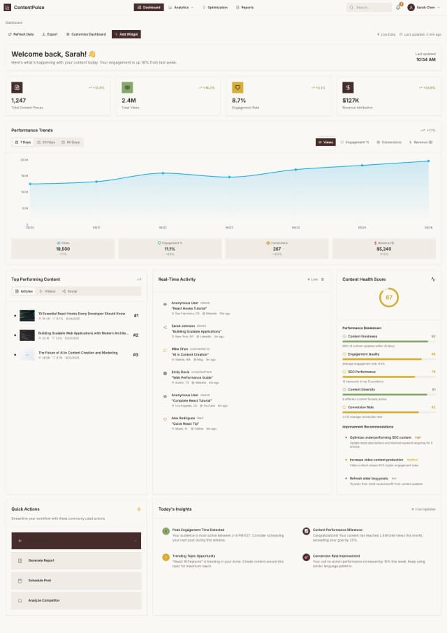 This content performance dashboard provides a clear overview of key marketing metrics. It helps users track website traffic, engagement, and conversions with intuitive charts and graphs. The tool also includes an SEO analytics section and the ability to view top-performing content, making it an essential resource for marketers and content creators to optimize their strategies.