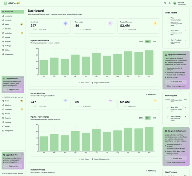 CRM Pro is a modern B2B SaaS workspace for sales teams. Clean white canvas, soft shadows, rounded corners. A focused left sidebar for navigation, a calm top bar with brand and version, and a dashboard that snaps you into what matters. Track accounts and contacts, move deals across a Kanban pipeline, log activities, preview email threads, and ship reports. Built with React, Tailwind, shadcn, Framer Motion, Recharts, TanStack Table, and Zustand or Redux. Accessible, fast, responsive.