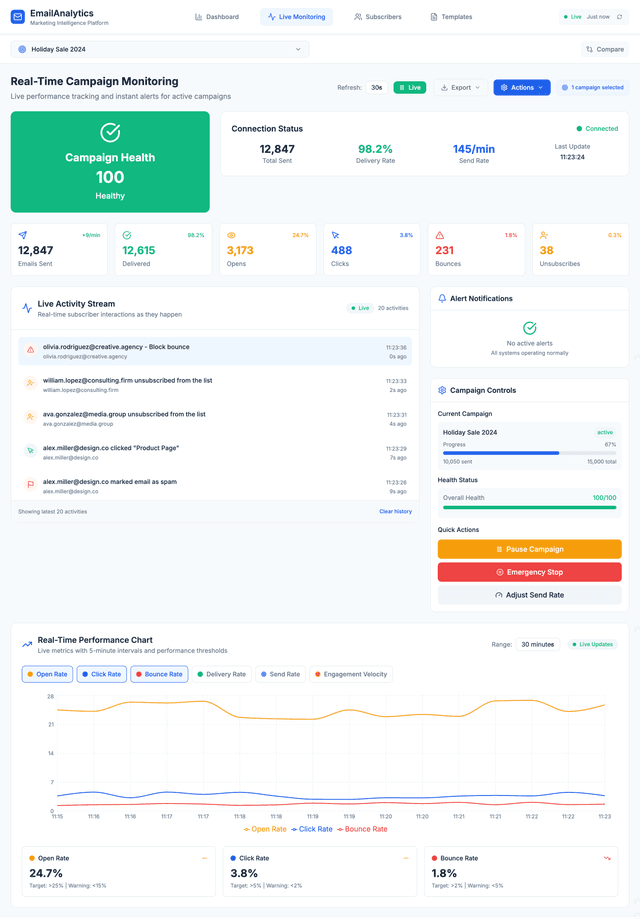 This email marketing dashboard provides a complete overview for managing your campaigns and growing your audience. Easily track key performance metrics like total revenue, subscriber growth, and campaign engagement rates. The platform helps you analyze results, monitor recent activity, and gain valuable insights to optimize your strategy.