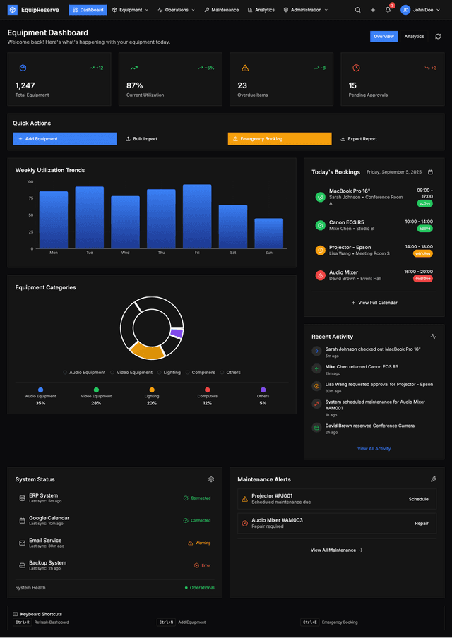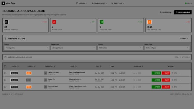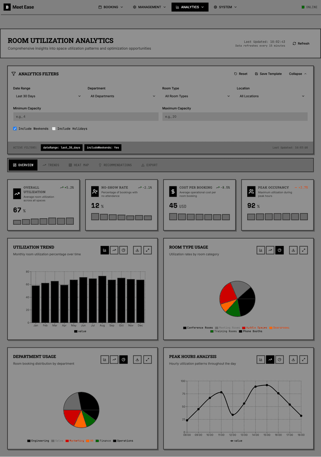 The Meet Ease template is a user-friendly meeting room management tool designed to streamline booking, management, and analytics. It offers a clear room inventory with details like location, capacity, and equipment, plus a notification center for updates. Features include quick booking, approval queues, user account management, and utilization analytics, making it easy for all users to schedule and manage rooms efficiently.