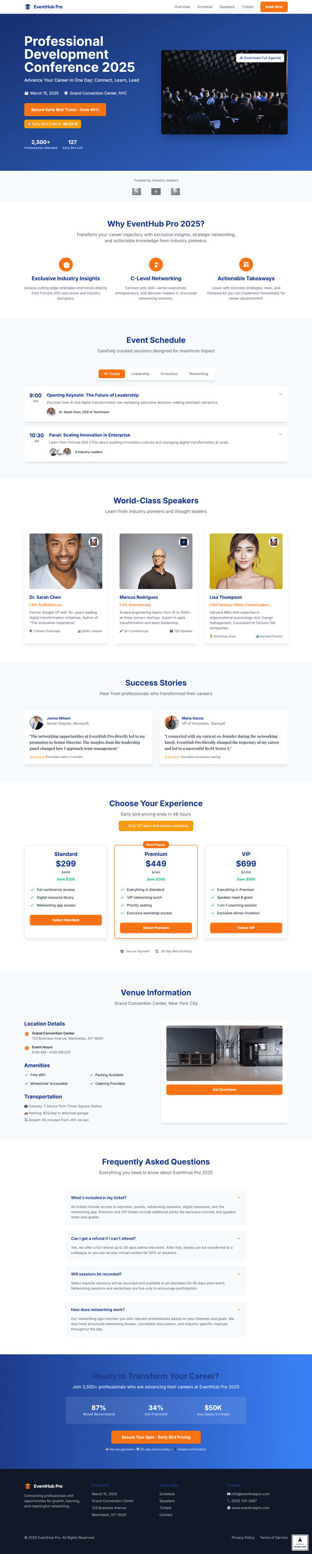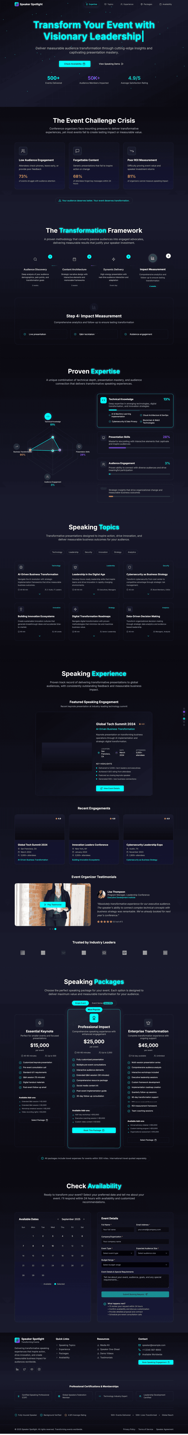 This Conference Speaker Spotlight landing page template is designed to showcase professional speakers and their expertise with a modern, engaging layout. It highlights key achievements, speaking topics, event packages, and availability in an easy-to-navigate format. Perfect for conferences, workshops, and leadership events, it helps organizers connect with speakers and book engagements seamlessly.