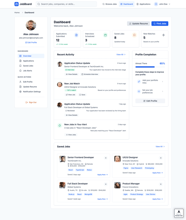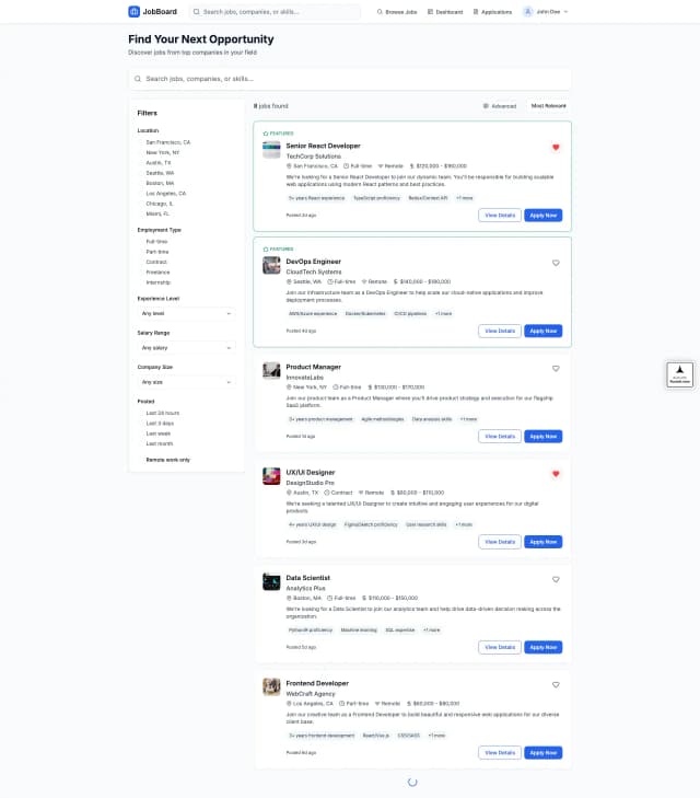 This Job Board template enables communities or organizations to launch a full-featured job marketplace. It includes advanced job search with filters, company profile pages, applicant tracking, saved jobs, and personalized job alerts. Employers can post jobs, manage applicants, and highlight company culture.
