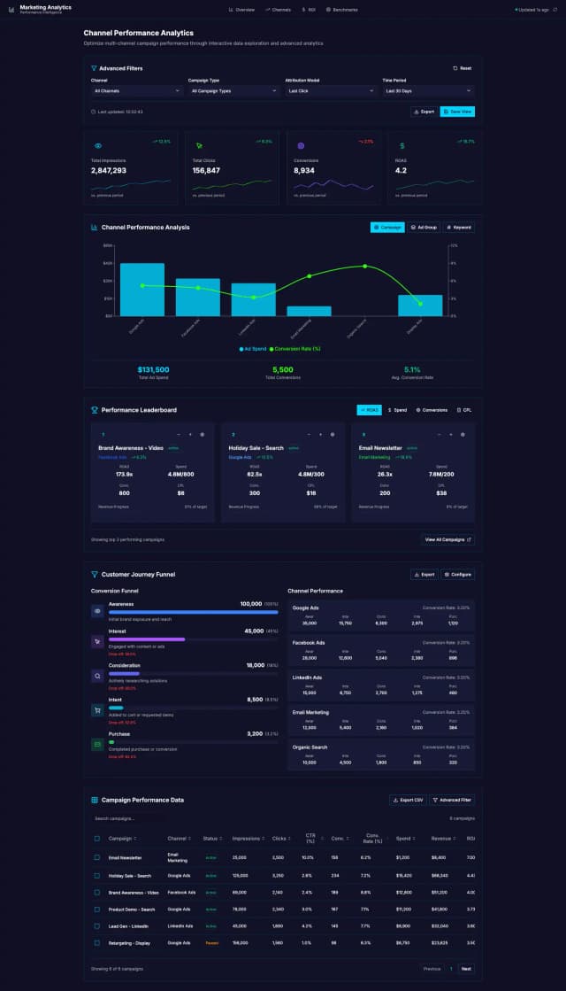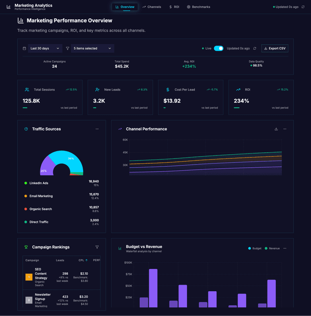 This template is a comprehensive marketing analytics dashboard that helps businesses track and optimize their campaigns. It offers key features like real-time performance tracking, ROI analysis, and competitive benchmarking. The user-friendly interface displays data through dynamic charts, graphs, and tables, making it easy to understand complex marketing metrics and improve campaign effectiveness.