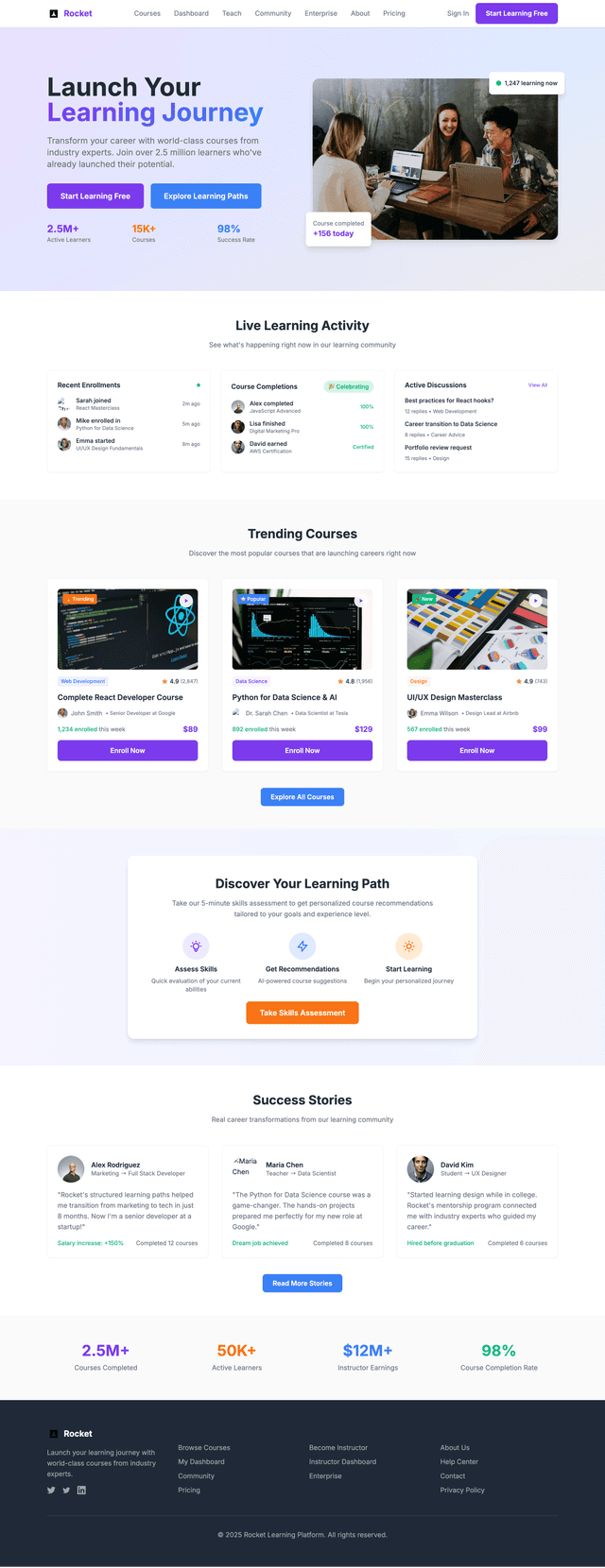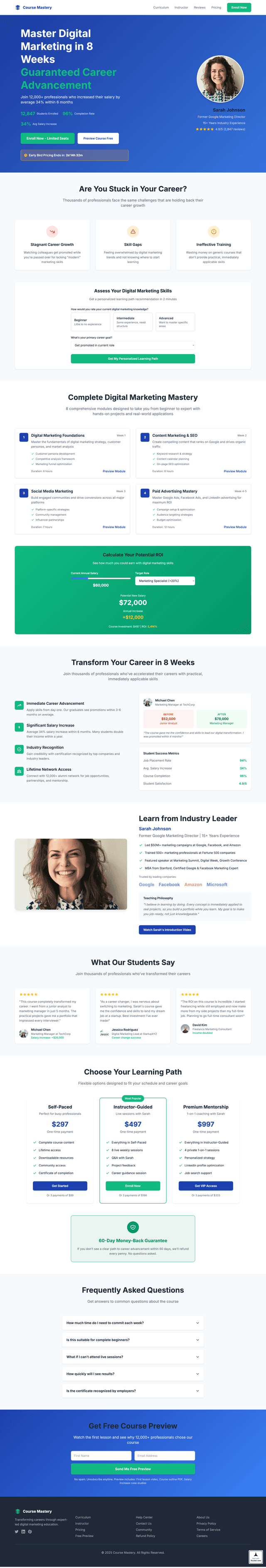 This course landing page helps promote digital marketing programs with a clear and persuasive layout. It showcases course details, instructor credentials, curriculum modules, student testimonials, and career outcomes. Pricing plans and enrollment options are clearly presented, with an optional email capture form for lead generation. This template is ideal for coaches, instructors, or academies to drive enrollments and offer online or hybrid learning programs.