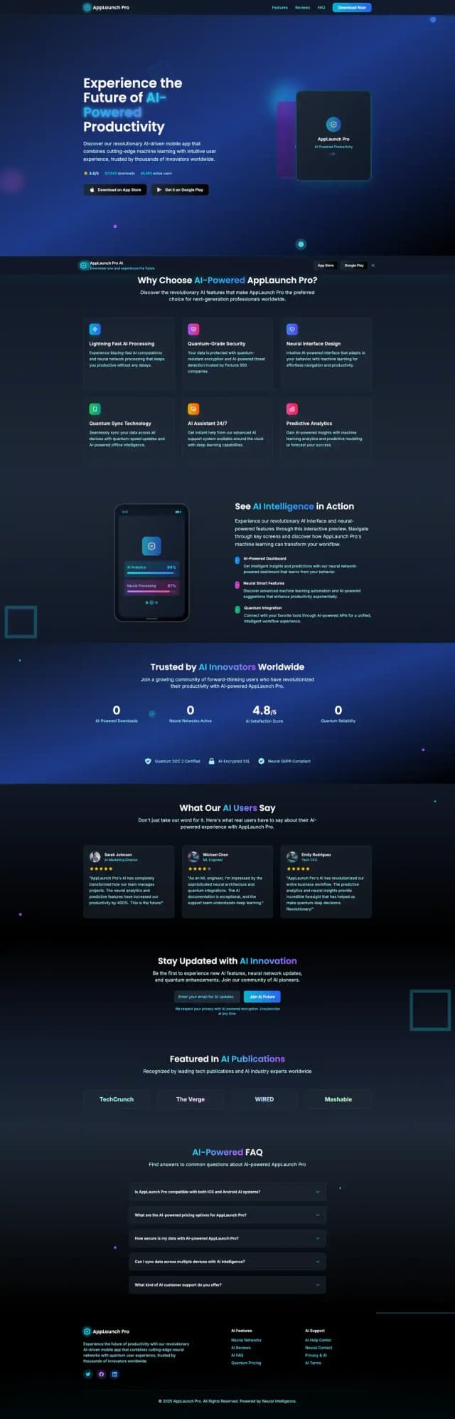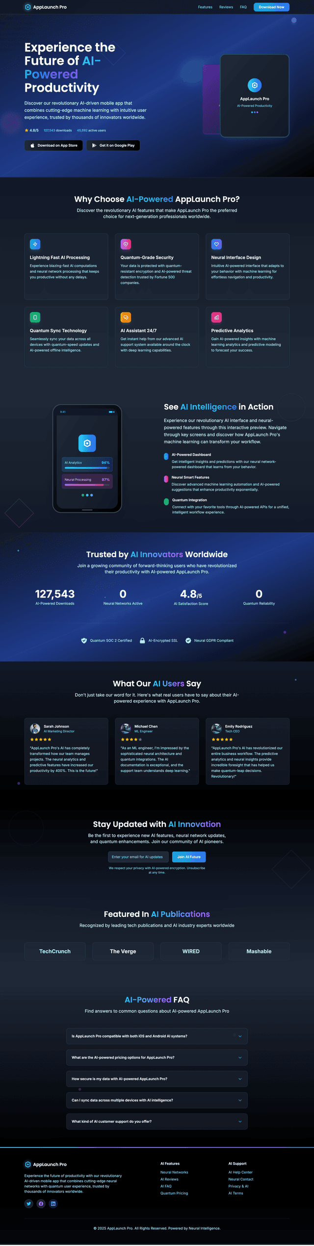 App Launch is a smart mobile app template designed to make work faster and easier for professionals and creators. It’s built with advanced AI for speed, strong security to protect your data, and a simple design that’s easy to use. Key features include live reports, an AI helper, smart suggestions, and syncing across all your devices. With a clean and modern look, this template highlights the app’s main benefits, real customer reviews, faq, and media mentions making it easy to understand for everyone.