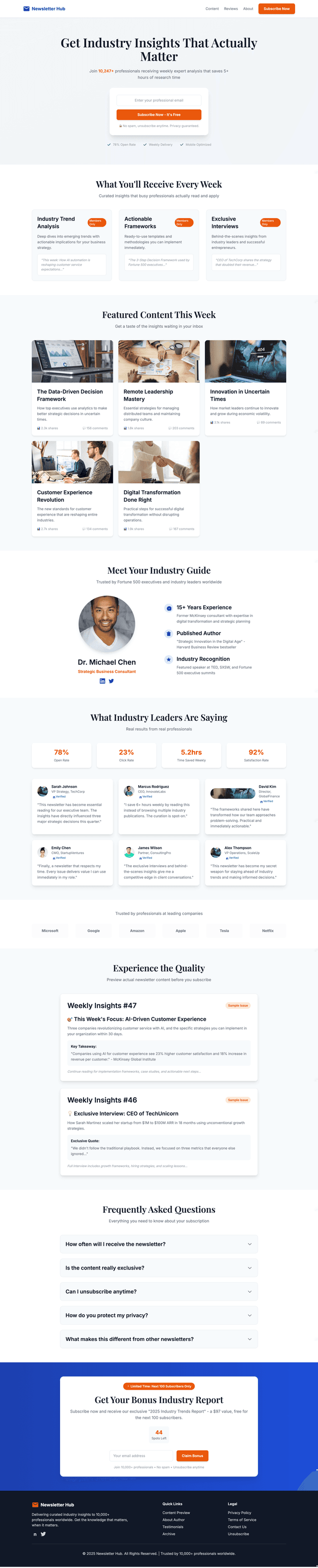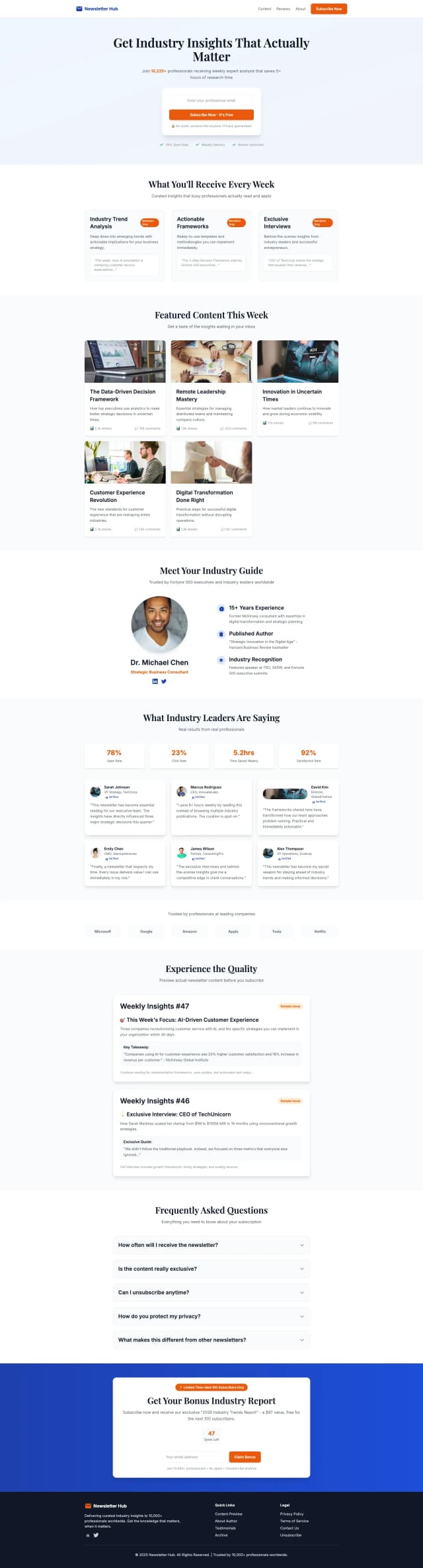 This modern, single-page template is your complete newsletter hub. It's designed to showcase your latest content, build credibility with genuine customer reviews, and grow your audience with a subscription form. The clean, user-friendly layout ensures a professional experience for all your readers.