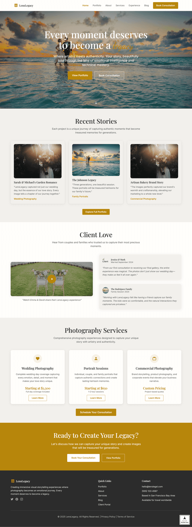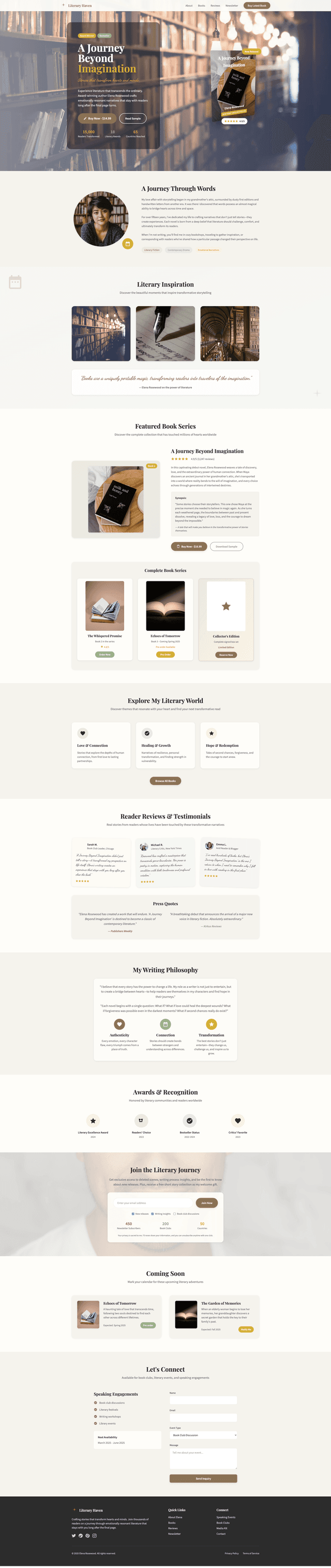 A personal brand site for an author to promote books, grow readership, and drive sales. Hero with 3D book cover, headline and CTAs. Sections: synopsis, author bio with portrait, book/series showcase, reader testimonials, press quotes, events, newsletter signup, and contact. Design vibe: warm, elegant, minimal, with literary charm. SEO structured with Book, Author, Review, and CreativeWork schema for discoverability.