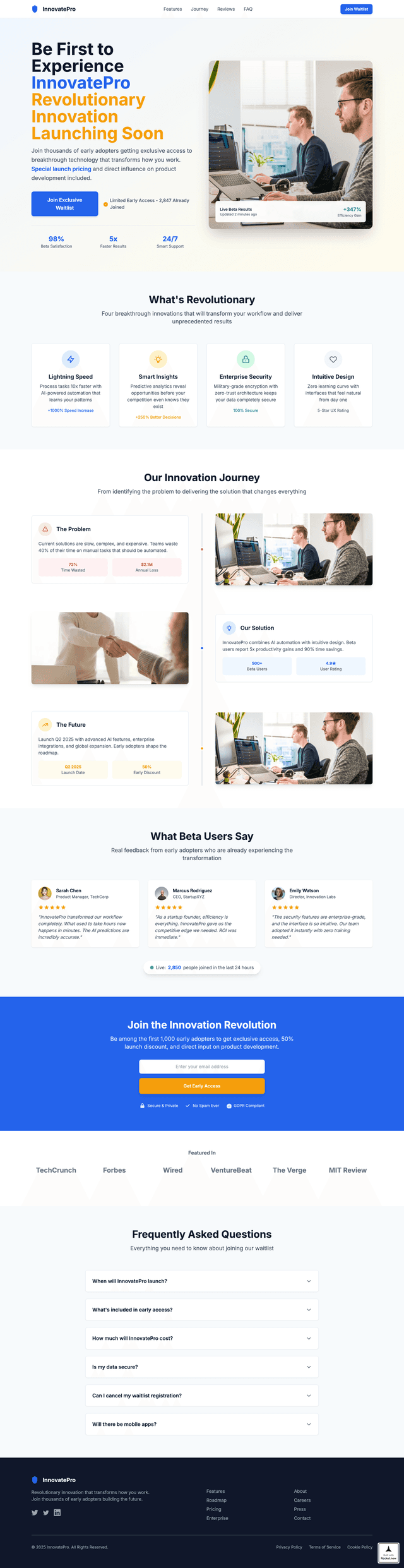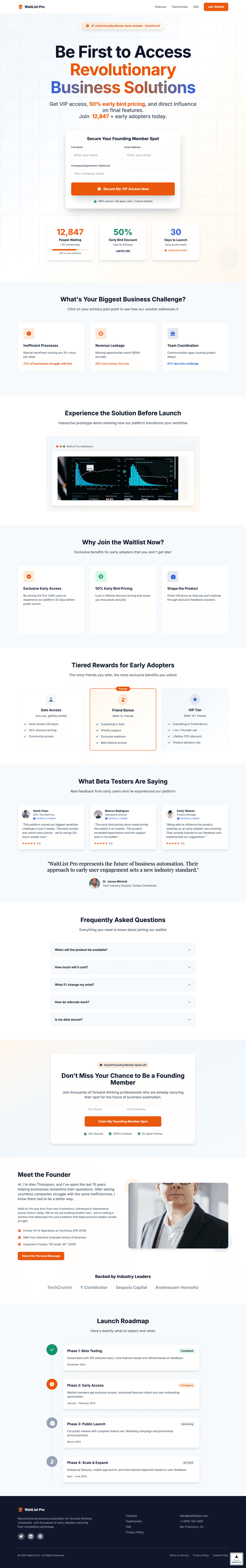 This waitlist signup template helps businesses pre-launch new products or services by capturing early interest. Visitors can easily join by submitting their email, while clear benefit highlights, testimonials, early adopter perks, and roadmap build excitement. Designed for high conversion, it's perfect for growing an audience ahead of launch, collecting leads, and validating market demand — all while offering VIP access, discounts, and exclusive insights for early supporters.