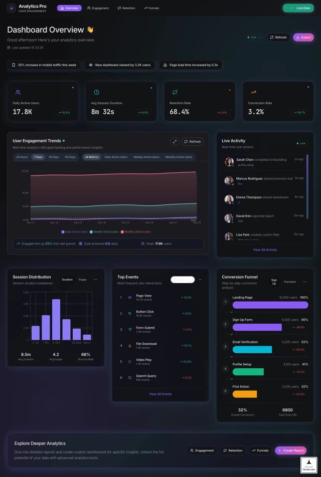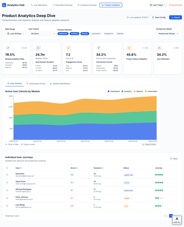 The Product Usage Analytics Dashboard Template delivers end-to-end visibility into user behavior, feature adoption, engagement health, and customer success metrics. Track real-time user activity, analyze feature-level adoption patterns, monitor churn risk, and optimize onboarding with cohort retention analysis. Executive overviews, deep-dive module insights, and live alerting enable data-driven product decisions.