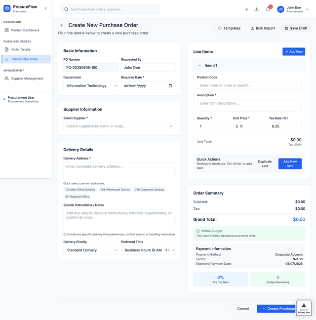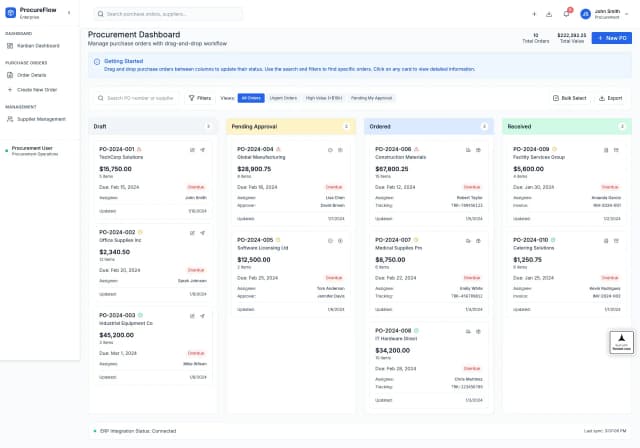 The Purchase Order Management Dashboard Template simplifies procurement workflows with an intuitive kanban board for tracking orders through draft, approval, ordering, and receiving stages. Users can create detailed POs, manage suppliers, monitor approvals, and analyze spend patterns via integrated analytics. Built-in ERP sync, quick actions, and compliance tracking ensure operational efficiency and transparency. Ideal for businesses managing vendor relationships and procurement at scale, this template streamlines purchasing from request to delivery
