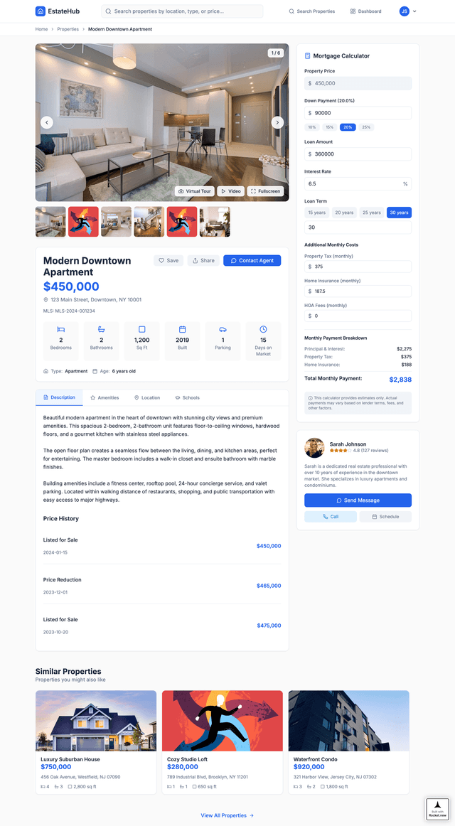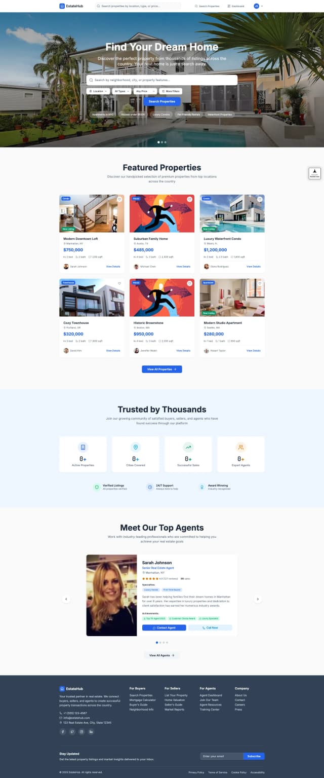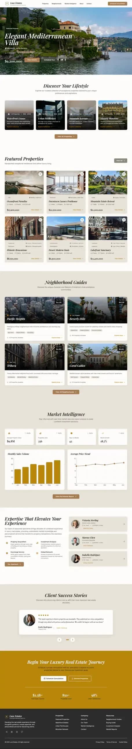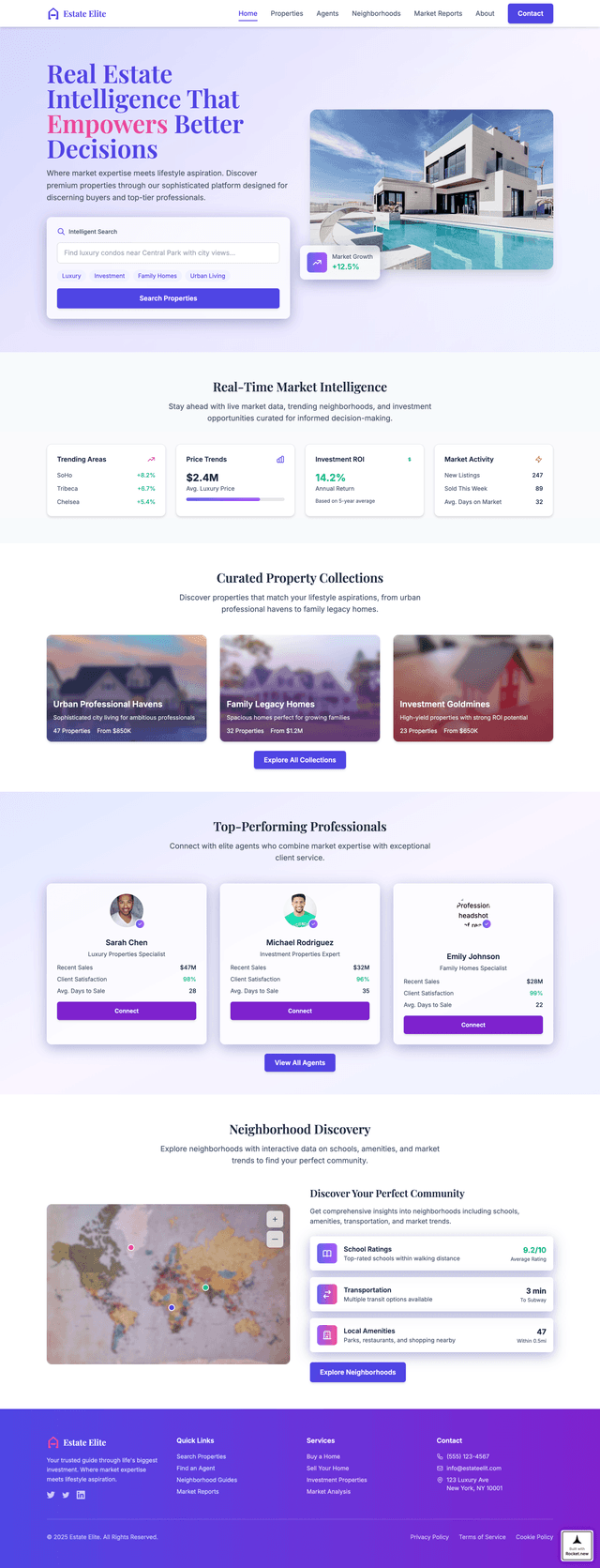 This Real Estate template offers an intelligent property discovery platform for premium buyers and sellers. It features curated property collections, top-performing agents, real-time market insights, and neighborhood discovery with interactive maps. Advanced filters, AI-powered recommendations, and expert reports help users make informed decisions. The template combines elegant UI with data-rich components, ideal for agencies or businesses offering luxury real estate services.