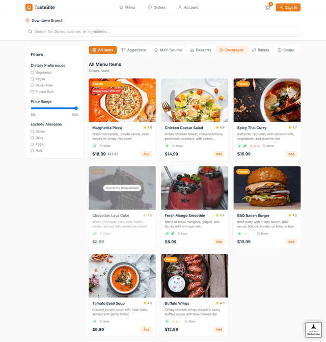 This all-in-one template provides a seamless online ordering system for restaurants. It offers a user-friendly experience for customers to browse and order quickly. For your team, a powerful dashboard helps you effortlessly track incoming orders, manage deliveries, and analyze business metrics to boost revenue and drive growth.