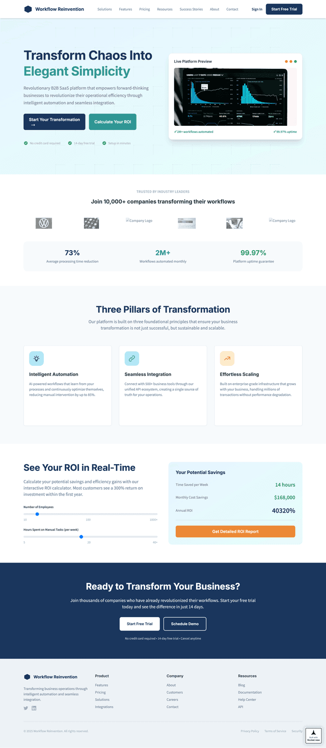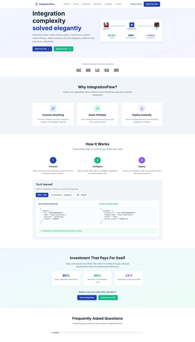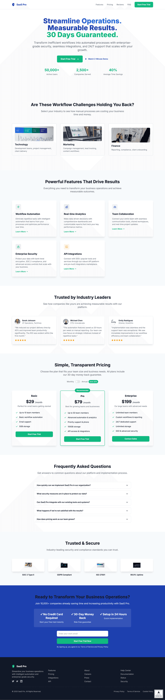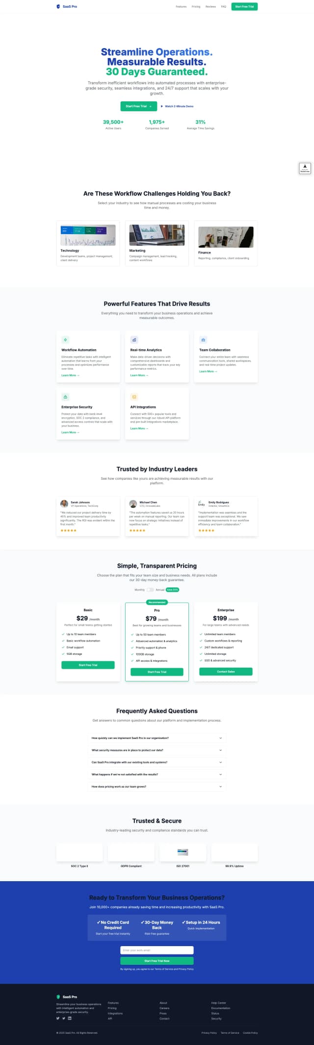 This SaaS landing page template is built to showcase software solutions with clarity and impact. It highlights workflow automation, analytics, security, and integrations while offering pricing plans, testimonials, and FAQs. Designed for startups and enterprises alike, it helps businesses present features, build trust, and convert visitors into customers with strong calls-to-action and a clean, professional layout.