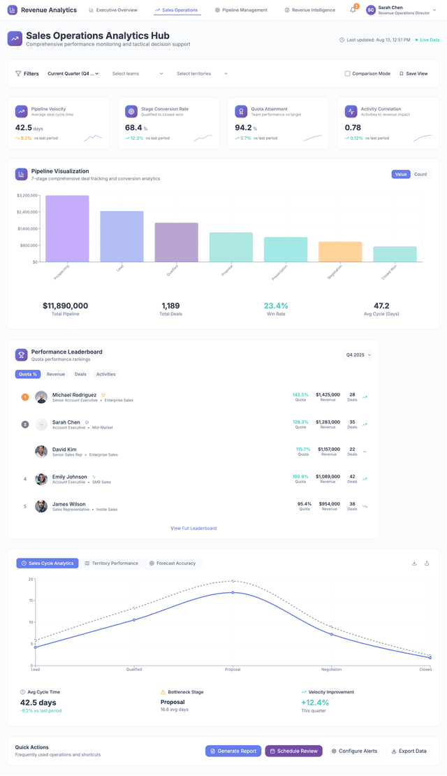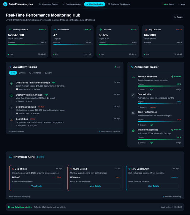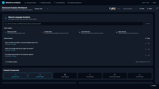 This Sales Performance Dashboard template provides a comprehensive view of sales data through a dark-themed interface. It features real-time monitoring of key metrics, pipeline analytics, and an analytics workbench with AI-powered insights. The dashboard is designed to help sales teams track performance, identify trends, and analyze deal probabilities and anomalies with an executive command center view. .