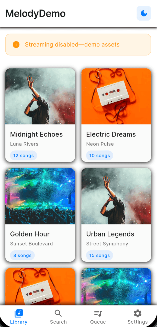 MelodyDemo is a sleek music streaming app template built with Flutter. It features a modern interface with a splash screen, song library, search with trending categories, a dynamic song queue, and settings for dark mode and equalizer presets. Ideal for developers and designers, it provides a realistic demo environment with mock data—perfect for showcasing music app functionality without backend integration.