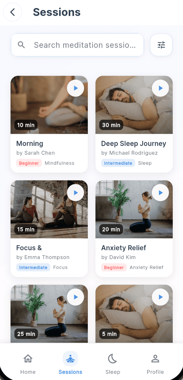 This meditation app template helps users start and maintain their mindfulness journey with ease. It offers guided sessions, sleep stories, and nature sounds to improve well-being. Users can track progress through achievements and challenges, choose from various session lengths and difficulty levels, and set personal goals. The friendly interface makes navigation simple for everyone, whether you are new or experienced in meditation practices.