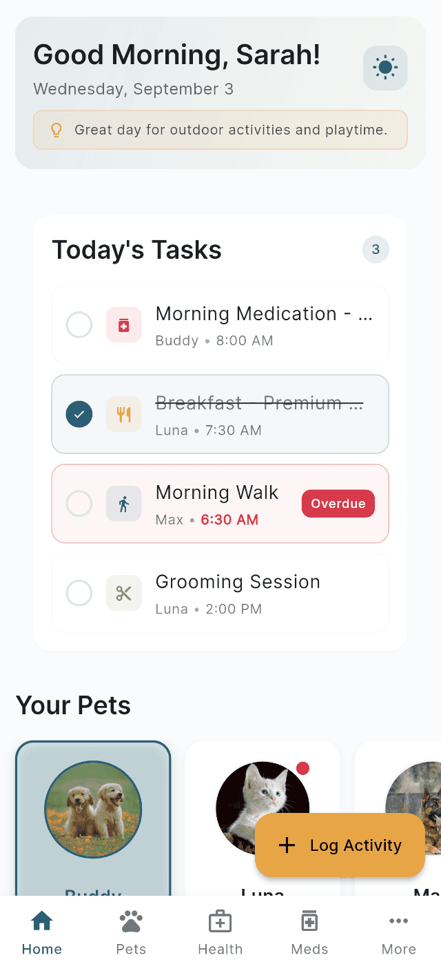 This pet care app template is a complete tool for managing your furry friend's life. It allows you to easily track feedings, daily walks, medications, and vet appointments. Keep your pet's health and wellness on track with this intuitive, all-in-one app designed to give you peace of mind.