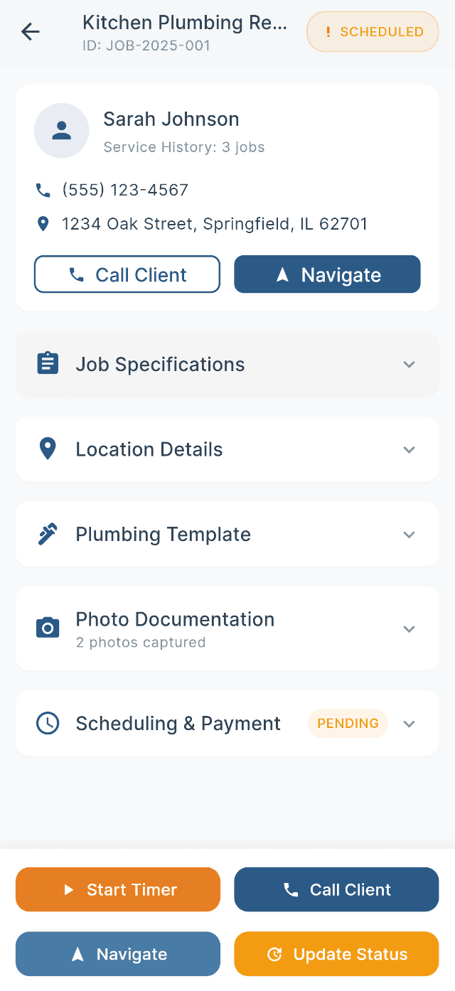 This template offers a streamlined mobile platform for field service providers. It empowers professionals to efficiently manage assigned jobs and track tasks in real time. The app features a clean dashboard, detailed client information, and integrated navigation, ensuring a smooth workflow from start to finish.