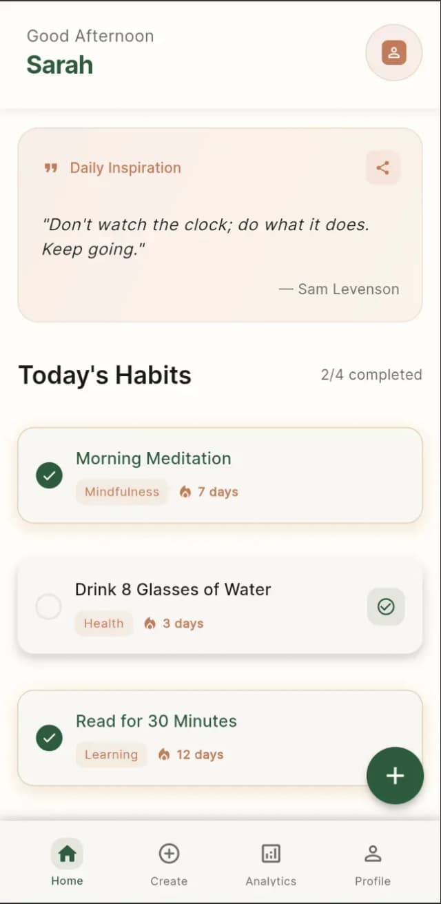 A habit tracker app that feels like a personal guardian — calm, warm, and quietly powerful. It’s not just about tracking tasks; it’s about creating rhythm, reflection, and emotional connection. Every tap feels intentional, every transition feels alive. With soft animations, natural tones, and intuitive design, users don’t just build habits — they build harmony.
