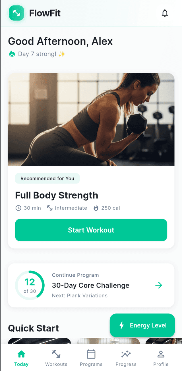 A modern, minimalist home workout mobile app designed to help users train anytime with personalized routines, guided programs, and progress tracking. The app delivers a smooth, distraction-free experience with dynamic content, quick access navigation, and a fixed bottom bar for seamless switching between screens.