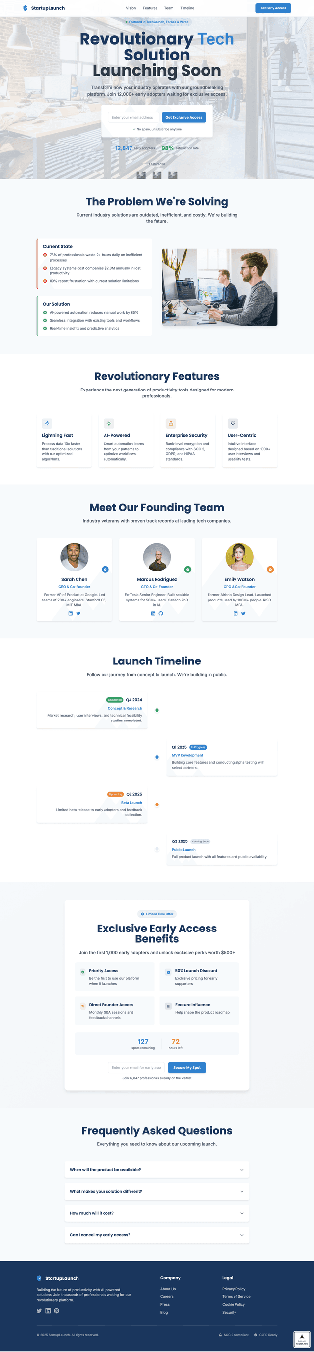 This startup launch landing page template is designed to introduce new tech solutions with clarity and impact. It highlights the problem being solved, showcases innovative features, and builds trust with a strong founding team section. With a clear launch timeline, exclusive early-access benefits, and FAQs, it helps startups attract early adopters, generate leads, and create excitement before going public.