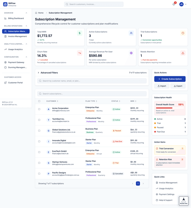 This template provides a complete subscription billing system for SaaS businesses. It includes features for managing recurring payments, metered usage, invoice generation, and subscription plans. Admins can track revenue trends, churn rates, and customer subscriptions, while customers get a self-service portal to manage payment methods and download invoices. The system integrates with Stripe, Razorpay, or Paddle, supports multiple currencies, taxes, and PCI-compliant payment flows, and includes smart dunning workflows to reduce failed payments.