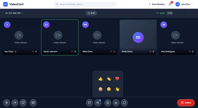 This video conferencing template is designed for modern communication and collaboration. It features a clean, professional interface for hosting meetings with participant management, chat functionality, and screen sharing. The template is an excellent solution for businesses and developers creating a reliable platform for virtual meetings and live events.