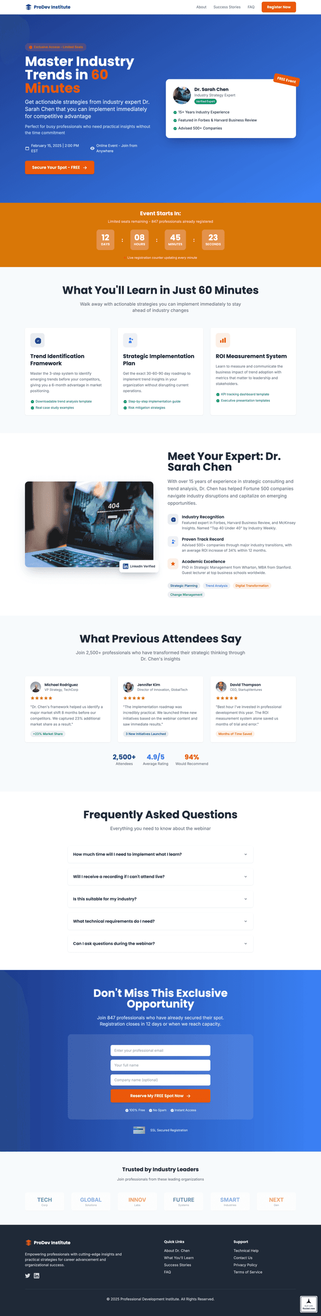 This webinar registration landing page helps businesses promote online events and capture sign-ups with ease. It includes an event overview, speaker bio, learning highlights, testimonials, FAQs, and a countdown timer to boost urgency. With a simple email form, responsive design, and conversion-focused layout, it’s ideal for experts and companies to share knowledge, generate leads, and expand their audience.