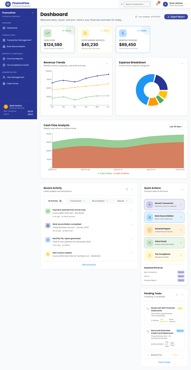 This React-based accounting web app template, FinanceFlow, is an all-in-one solution for small firms and freelancers. It automates your bookkeeping, invoicing, bank reconciliation, and tax compliance so you can focus on your business. Upload data from Excel or QuickBooks, set up recurring invoices and reminders, and view real-time financial reports like cash flow, P&L, and trial balance. Role-based access and audit logs keep everything secure.