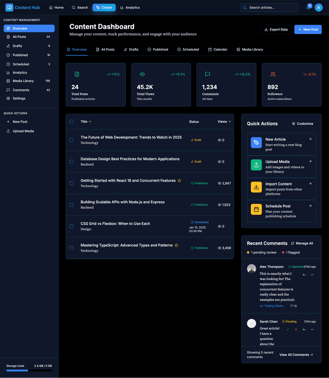This Content Hub template is a full-featured blogging platform designed for content creators and marketers. It includes a robust Content Dashboard for managing and tracking posts, a powerful analytics dashboard to monitor performance, and an intuitive post-creation editor with Markdown support. The template is perfect for efficiently managing your content lifecycle, from drafting and publishing to analyzing audience engagement.