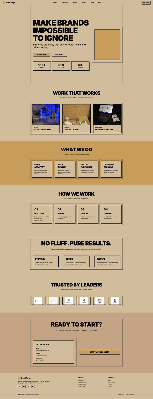 A minimal, brutalist brand agency site. Interactive 3D hero, visual case reel, expanding capability tiles, four-step process, tiny about, logo grid, and a conversational brief with budget slider.