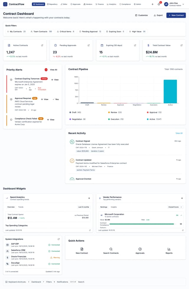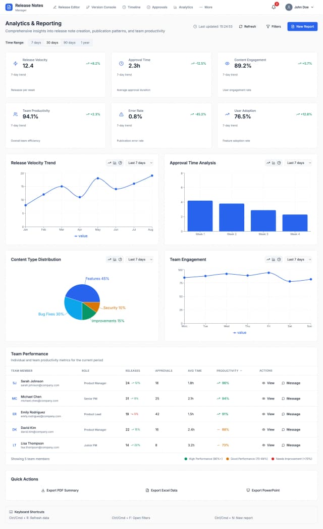 The DevOps Analytics Dashboard gives real-time visibility into repository health, pull-request performance, CI pipeline efficiency, and developer productivity. It helps engineering managers identify bottlenecks through PR analytics, forecasts, coverage insights, and correlation matrices—all with interactive charts and exportable reports.