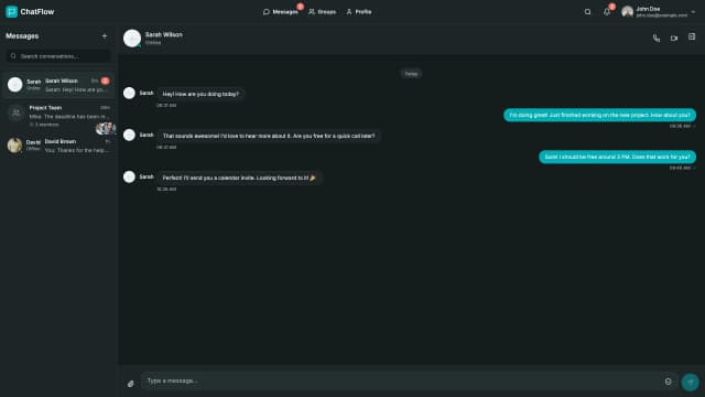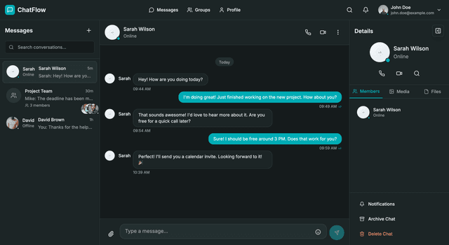 This template is a real-time chat flow app, designed for seamless communication. It offers group management with customizable settings, message editing, media sharing, and read receipts. Users can manage profiles, privacy, and notifications, while enjoying typing indicators and auto-archiving. Ideal for teams, it ensures secure, instant messaging with an intuitive interface for all users.