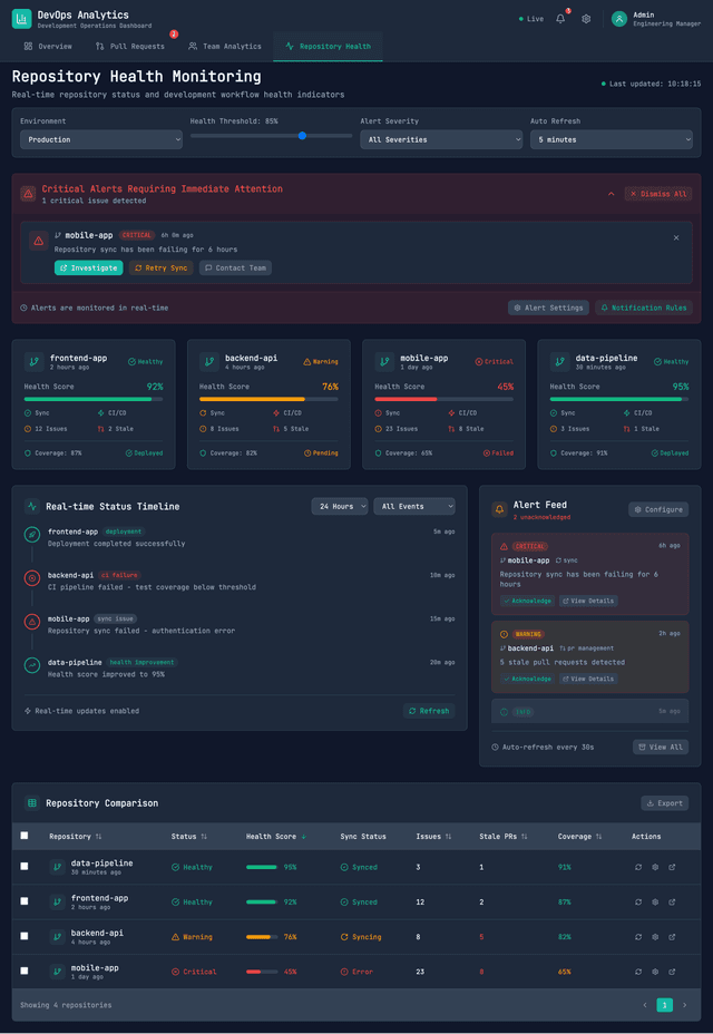 This GitHub activity dashboard provides a visual overview of your projects and team contributions. Easily track key metrics like commits, pull requests, and issues to monitor project progress and individual performance. The platform helps both technical and non-technical users gain clear insights into development activity.