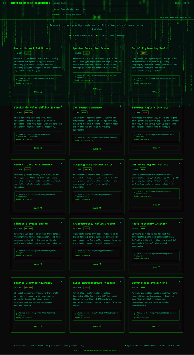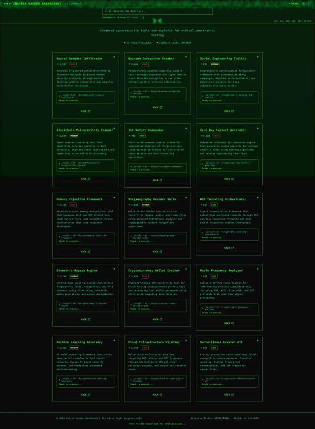 This hacker-themed landing page template offers a futuristic, Matrix-style design perfect for cybersecurity projects, ethical hacking showcases, or tech portfolios. With a bold dark aesthetic, interactive tool cards, and animated effects, it creates an immersive experience for users. Ideal for security professionals, developers, or creative tech brands, it highlights features and tools in a visually engaging way.