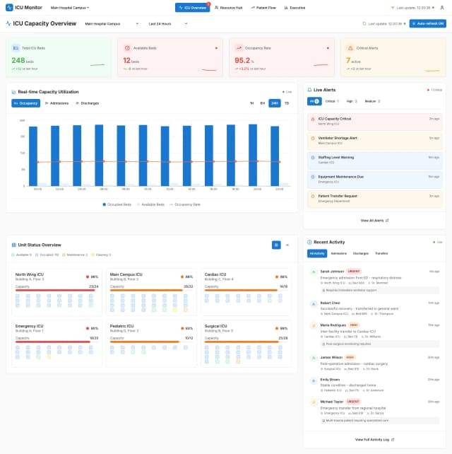 A responsive, real-time ICU capacity web dashboard designed for clarity and urgency. It offers a professional yet human-centered interface that helps users quickly assess ICU availability, occupancy, and critical stats with precision and ease.