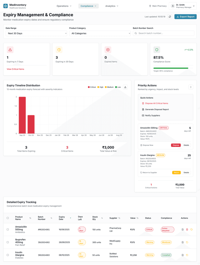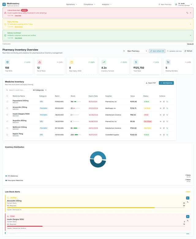 The Pharmacy Inventory Management Dashboard Template helps pharmacies track stock levels, expiry dates, compliance, and supply chain performance in real time. It provides advanced analytics for demand forecasting, supplier reliability, and inventory turnover. With critical alerts for low stock and expiring medicines plus quick reorder actions, it reduces waste, ensures availability, and boosts efficiency in hospital and retail pharmacies.