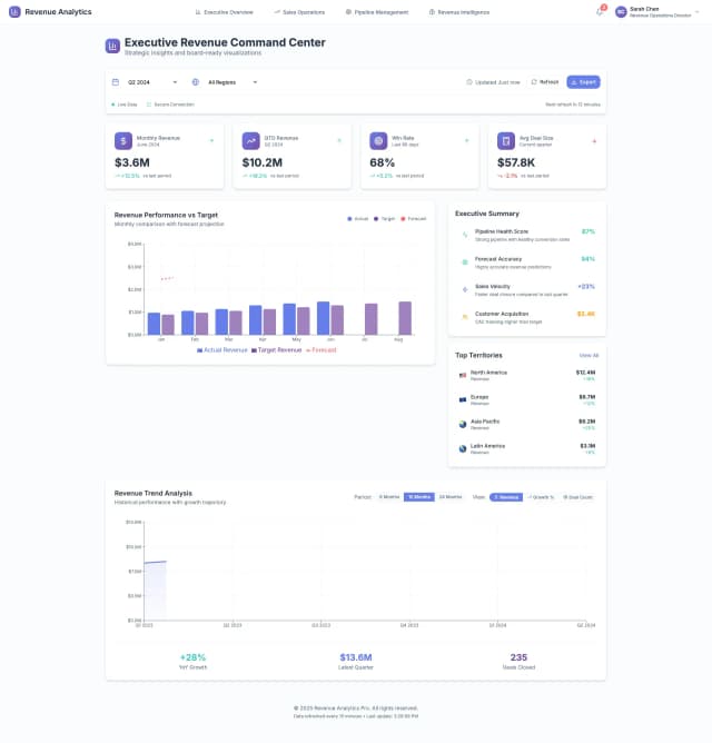 Revenue Analytics is a comprehensive business intelligence dashboard template designed for tracking, forecasting, and optimizing sales performance. It features executive revenue overviews, pipeline monitoring, predictive analytics, and anomaly detection. Users can view real-time KPIs, visualize conversion funnels, monitor deal health, and analyze territory performance. Ideal for executives and sales teams, it delivers actionable insights through clean, interactive, and data-driven visualizations.