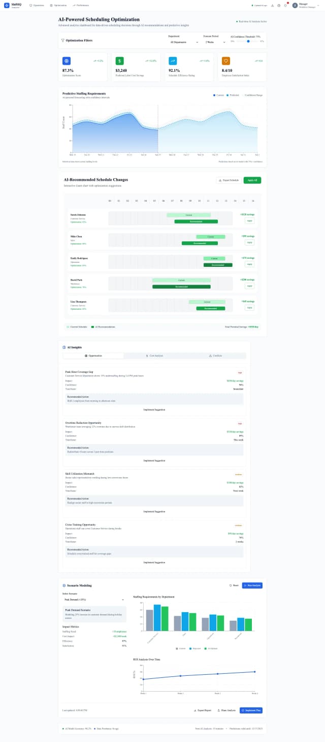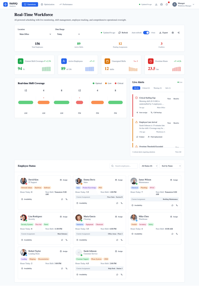 ShiftIQ is an internal tool for managing workforce scheduling and performance. It provides real-time operational oversight, AI-powered shift optimization, and detailed employee performance analytics. This template helps managers monitor shift coverage, track key metrics like efficiency and overtime, and generate smart schedules to improve productivity and operational efficiency.