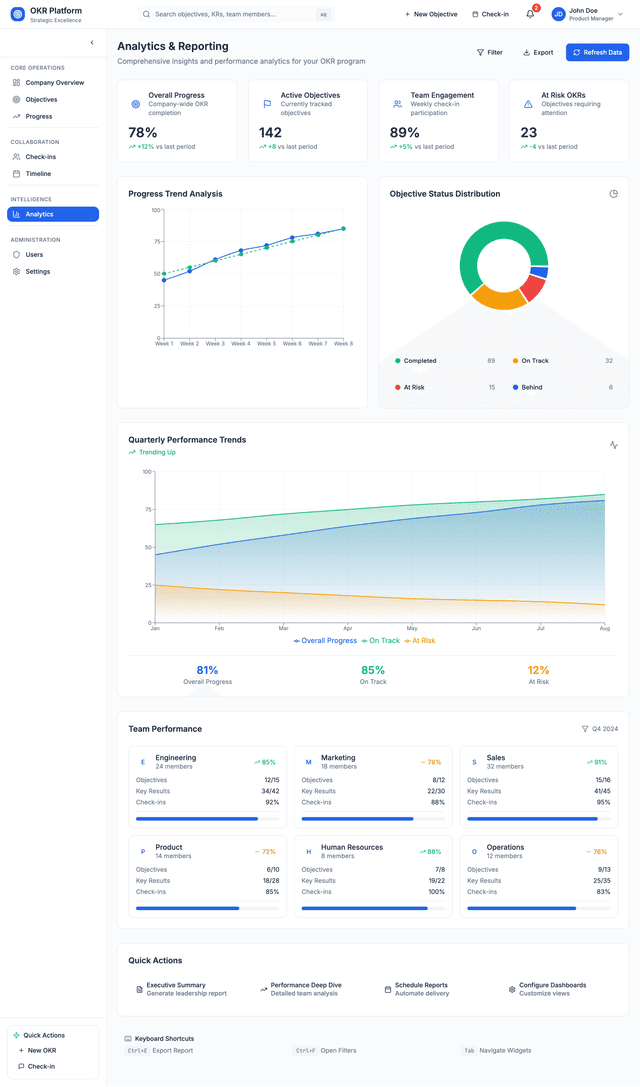 The OKR Platform template is a powerful tool for managing objectives, key results, and team collaboration. It provides a clear timeline view to track milestones, progress, and dependencies across departments. Features include analytics for performance insights, team check-ins for real-time updates, and customizable dashboards. Suitable for both technical and non-technical users, it enhances strategic planning and alignment with an intuitive interface and comprehensive reporting.