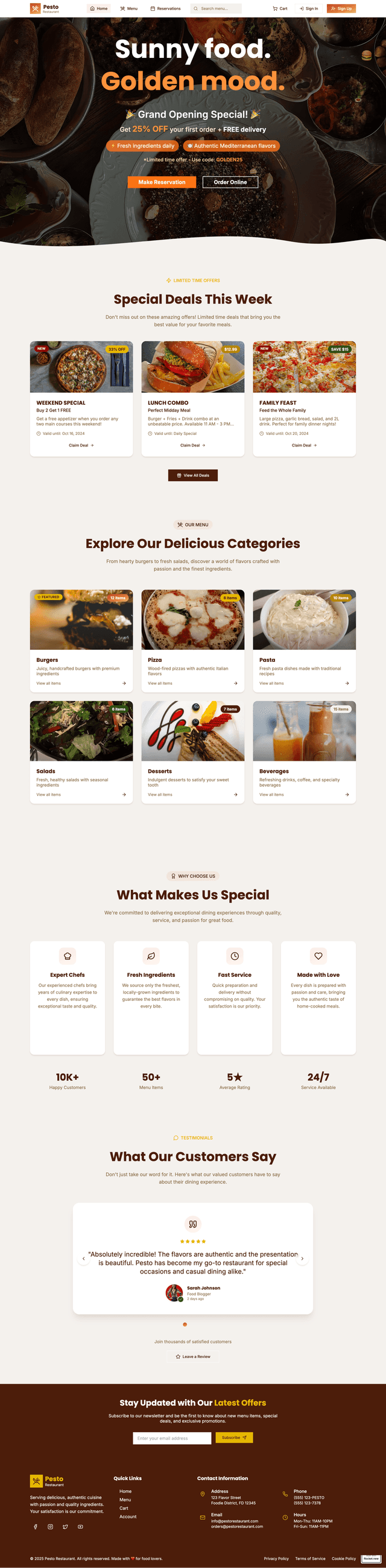 Pesto Restaurant combines online food ordering, table booking, and menu exploration into one sleek platform. Enjoy Mediterranean-inspired meals, track your orders, and reserve your spot with a single click through a beautifully designed interface.