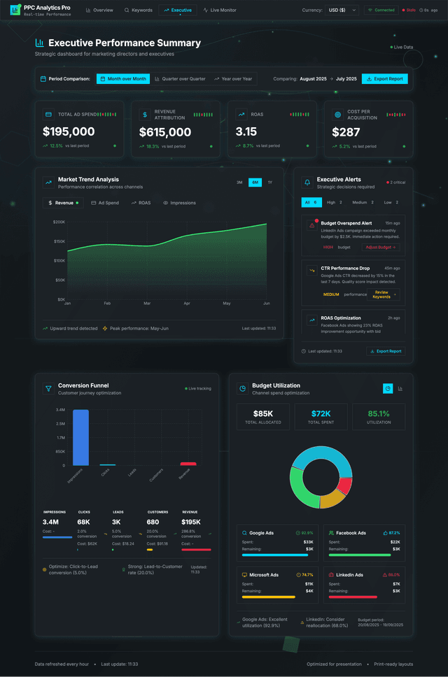 This PPC Analytics template is designed to help businesses track, analyze, and optimize their ad campaigns with ease. It provides real-time performance monitoring, keyword insights, automated alerts, and executive summaries for smarter decision-making. With features like budget tracking, trend analysis, conversion funnels, and live monitoring, it simplifies complex data into clear, actionable insights—making it useful for both marketing professionals and non-technical users.