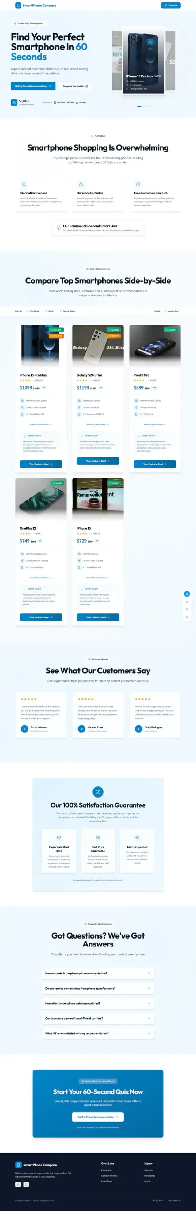 A calm, premium smartphone comparison landing page that helps users quickly discover, compare, and choose the best phone for their needs. The design uses soft mint-aqua gradients, lots of white space, editorial typography, and clean layouts that feel trustworthy, modern, and user-centric. The goal is to reduce overwhelm and make choosing a phone simple, guided, and transparent.