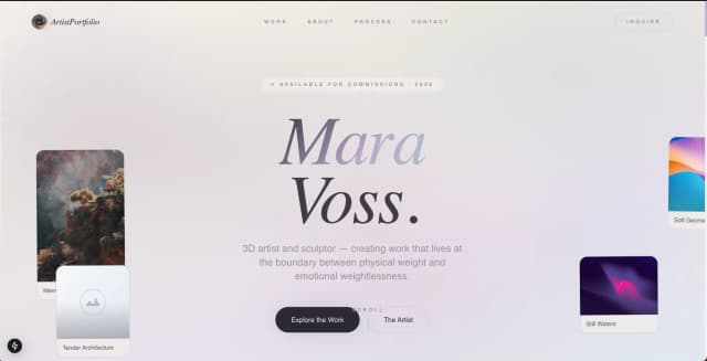A minimal, editorial-style portfolio website template designed for visual artists, sculptors, and creative professionals presenting personal work and commissions. It features a refined typographic hero section, soft gallery previews, commission availability messaging, and clear pathways to explore the portfolio or learn about the artist. Built for independent artists and creative practitioners who need an elegant online presence to showcase their work, communicate their style, and attract inquiries.