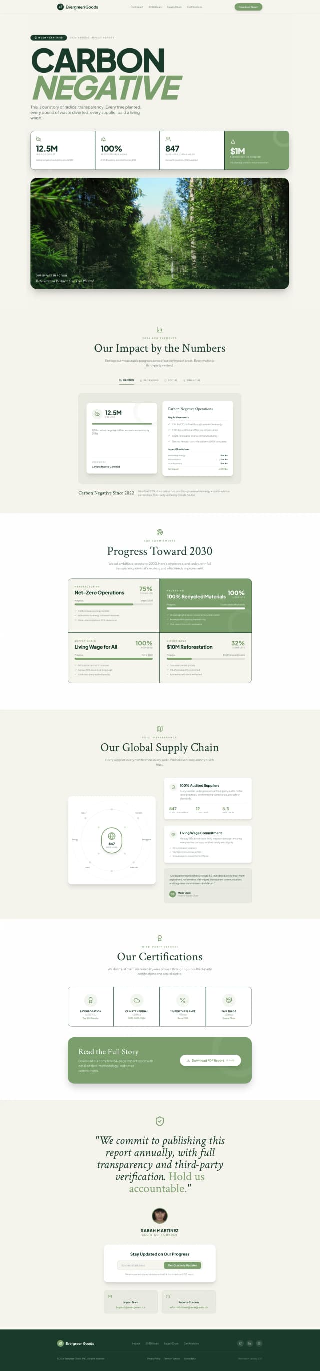 An earthy, transparent landing page for Evergreen Goods’ 2024 Impact Report, showcasing verified sustainability progress. Forest green tones, recycled paper textures, and infographic-style visuals set a trustworthy tone. Features hero with bold impact headline and key stat, interactive impact dashboard, 2030 goal progress trackers, supply chain transparency map, employee wellbeing metrics, certification badges, full report PDF download, and a “Hold Us Accountable” pledge—communicating credibility, accountability, and long-term impact.
