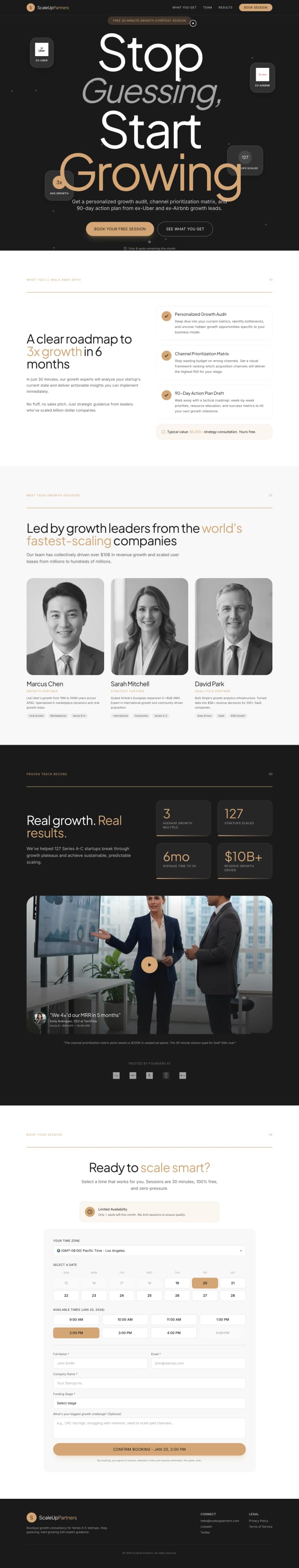 A premium, conversion-focused landing page that helps Series A–C startup founders stop guessing and start growing by clearly showcasing ScaleUp Partners’ expertise through a compelling value proposition, credible consultant profiles, proven client results, and a high-value free strategy session—featuring a personalized growth audit, channel prioritization, and a 90-day action plan—delivered in a polished, consultative design that builds trust, creates urgency, and makes booking seamless and intuitive.