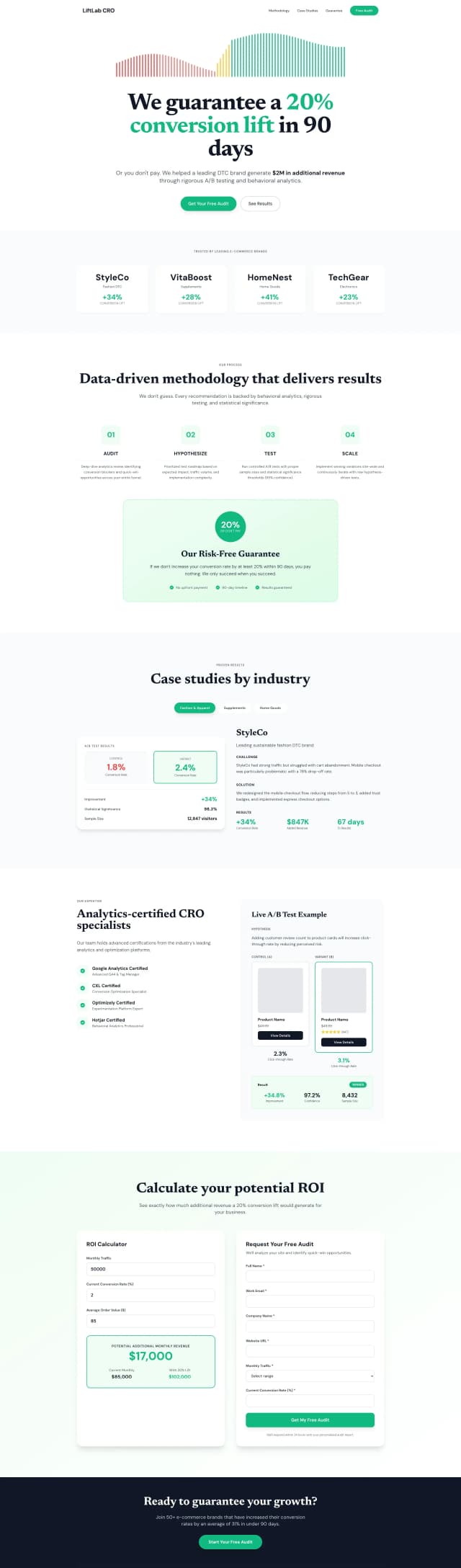 A data-driven landing page for *LiftLab CRO*—a boutique agency boosting e-commerce conversions through A/B testing and behavioral analytics. Clean white design with bold green metric highlights and chart-led visuals emphasizes results. Features hero with standout revenue win, client logos with lift percentages, methodology breakdown, A/B test visualization, industry case studies, team credentials, ROI calculator preview, risk-free guarantee, and audit request form—communicating precision, confidence, and measurable growth.